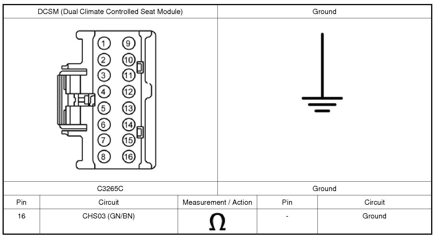 NOTICE: When taking measurements at DCSM (Dual Climate Controlled Seat Module) harness connectors, do not insert the electrical probes into the female connector pins. Inserting the probes into connector pins can cause intermittent or open electrical connections after reassembly resulting in DTCs (Diagnostic Trouble Codes) and system failure. Touching the tip of these connector pins is recommended instead.