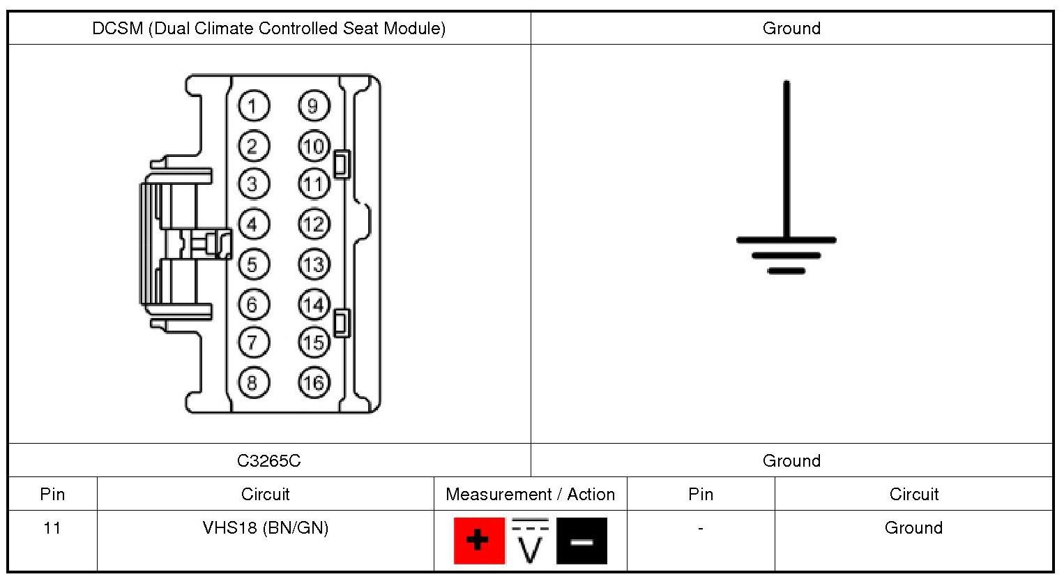 NOTICE: When taking measurements at DCSM (Dual Climate Controlled Seat Module) harness connectors, do not insert the electrical probes into the female connector pins. Inserting the probes into connector pins can cause intermittent or open electrical connections after reassembly resulting in DTCs (Diagnostic Trouble Codes) and system failure. Touching the tip of these connector pins is recommended instead.