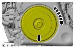 NOTICE: Do not loosen or remove the crankshaft pulley bolt without first installing the special tools as instructed in this procedure. The crankshaft pulley and the crankshaft timing sprocket are not keyed to the crankshaft. The crankshaft, the crankshaft sprocket and the pulley are fitted together by friction, using diamond washers between the flange faces on each part. For that reason, the crankshaft sprocket is also unfastened if the pulley bolt is loosened. Before any repair requiring loosening or removal of the crankshaft pulley bolt, the crankshaft and camshafts must be locked in place by the special service tools, otherwise severe engine damage can occur.