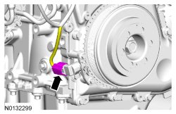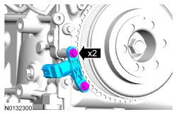 3. Install the 303-1521. If the 303-1521 does not align with the TDC (Top Dead Center) marked tooth on the crankshaft pulley, loosen the 2 CKP (Crankshaft Position) sensor bolts and adjust the sensor until the tool is installed.