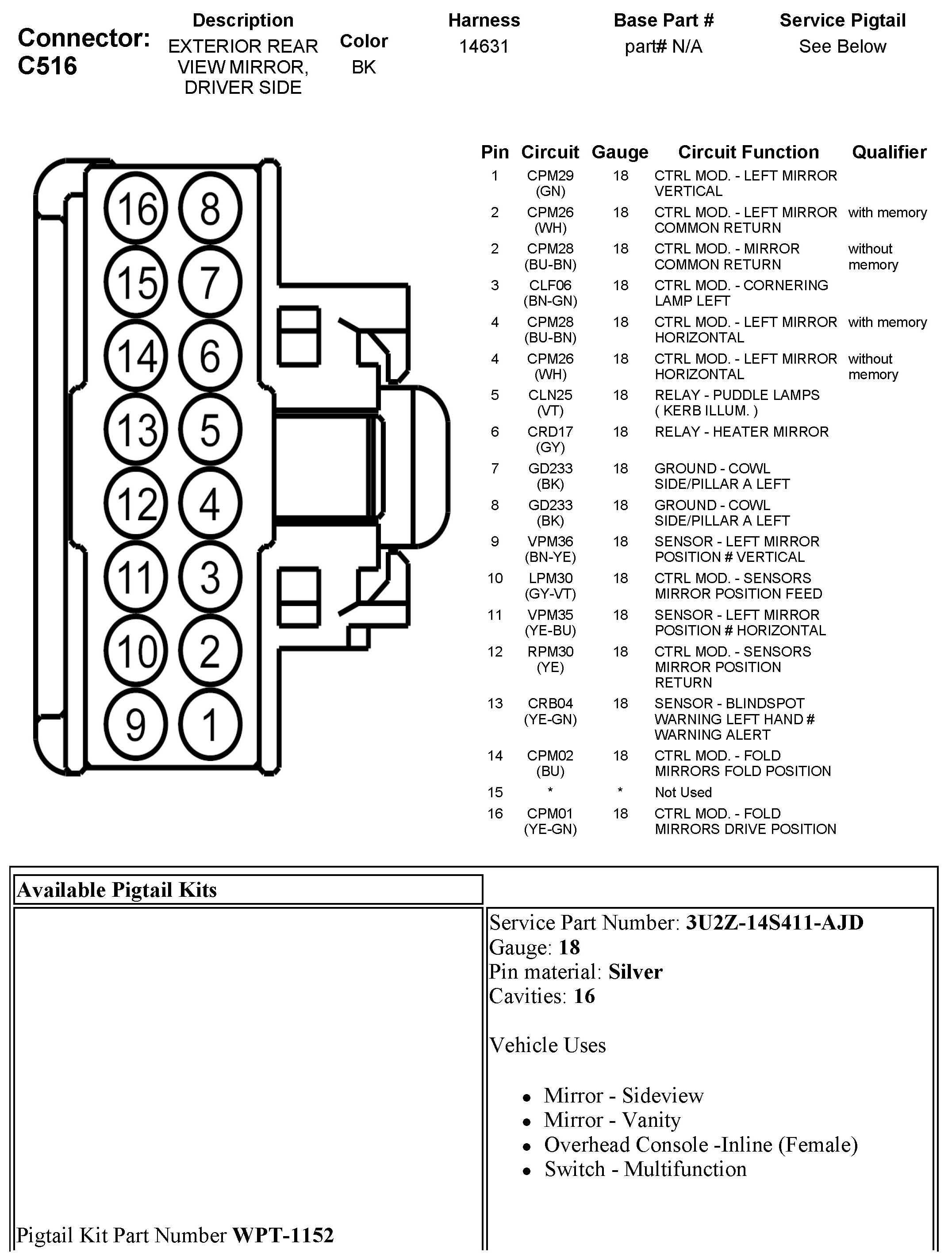 C516 Exterior Rear View Mirror, Driver Side