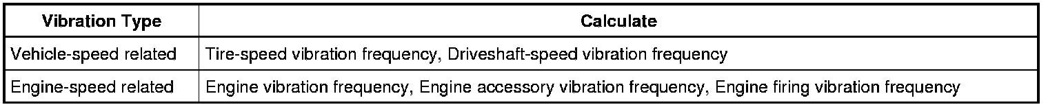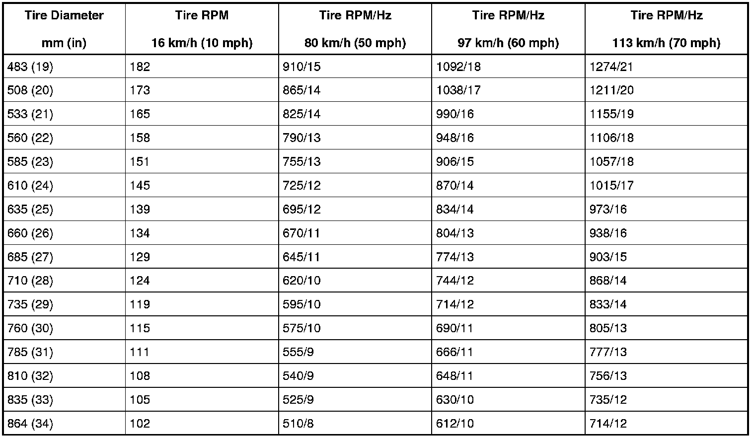 - If the vehicle speed is not listed, calculate the tire and wheel frequency as follows: