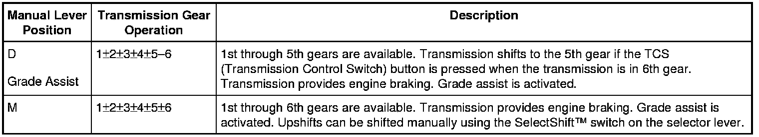 This transaxle has 5 range positions: P, R, N, D and M for vehicle equipped with SelectShift(TM) .