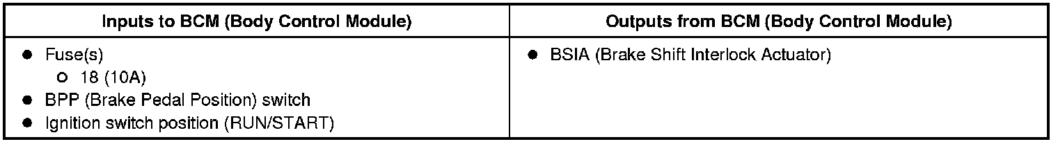 The BSIA (Brake Shift Interlock Actuator) inhibits the selector lever movement from the PARK position by mechanically blocking the detent pawl of the selector lever mechanism. When the brake pedal is applied with the ignition key in the RUN/START position and the transmission in PARK, the BSIA (Brake Shift Interlock Actuator) is energized by the BCM (Body Control Module), this allows the selector lever to be moved out of the PARK position.