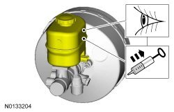 NOTICE: Do not spill brake fluid on painted or plastic surfaces or damage to the surface may occur. If brake fluid is spilled onto a painted or plastic surface, immediately wash the surface with water.