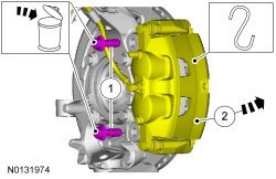 2. NOTICE: Do not allow the caliper and anchor plate assembly to hang from the brake hose or damage to the hose can occur.
