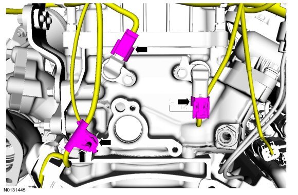 167. Connect the 2 fuel charge harness and the Fuel Rail Pressure (FRP) electrical connectors. Connect the KS (Knock Sensor) sensor electrical connector.