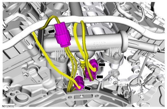 144. NOTICE: It is very important to visually inspect the routing of the fuel charge wire harness to make sure that they will not be pinched or damaged between the fuel rail and the cylinder head during installation.