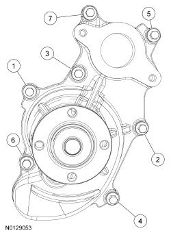 Using new coolant pump gasket and coolant pump O-ring seal, install the coolant pump and the 7 bolts and tighten in 2 stages in the sequence shown.
