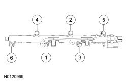 Install the LH fuel rail assembly and the 6 new bolts. Tighten in 3 stages in the sequence shown.