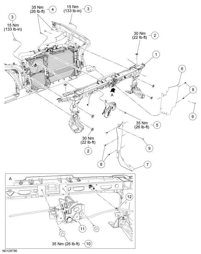 14. NOTE: Inspect all of the radiator grille support insulters. Replace as necessary.