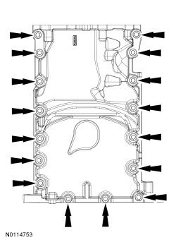 Using a pry tool, locate the 2 pry pads at the LH and RH side of the oil pan and pry the oil pan loose and remove.