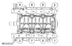 Remove the 8 main bearing cap bolts in the sequence shown.