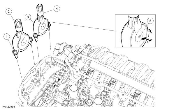NOTE: The LH or RH valve cover must be removed to perform this procedure. For additional information, refer to Engine.
