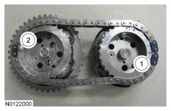 16. Install the RH VCT (Variable Camshaft Timing) assemblies and the secondary timing chain onto the RH camshafts to a position 2 mm (0.078 in) from fully seated. The timing mark on the exhaust VCT (Variable Camshaft Timing) assembly should be in the 1 o'clock position.