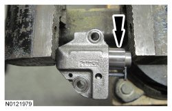 Compress the primary timing chain tensioner plunger, using an edge of a vise.