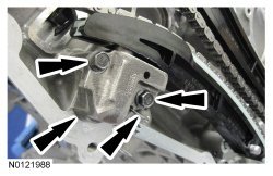 Install the 3 RH intake VCT (Variable Camshaft Timing) assembly bolts and the 3 RH exhaust VCT (Variable Camshaft Timing) assembly bolts.
