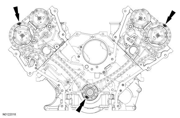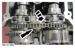 - Align the colored link on the timing chain with the timing mark on the RH VCT (Variable Camshaft Timing) assembly.