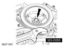 16. Using the Strap Wrench, install a new crankshaft pulley bolt and the original washer, tighten the bolt in 4 stages: