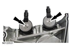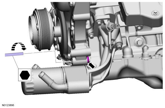 5. Using a 10 mm Hex Bit, rotate the engine front cover jackscrew into contact with the oil filter adapter to 5 Nm (44 lb-in).