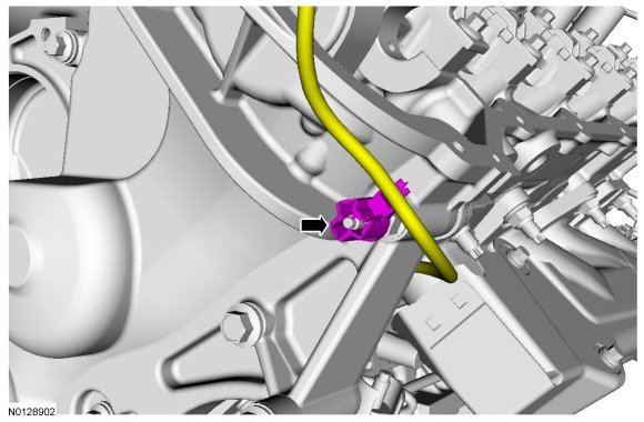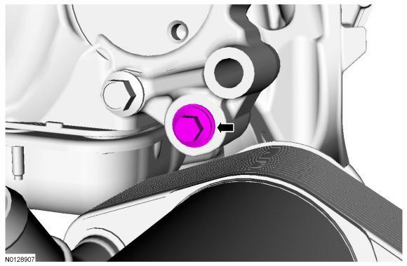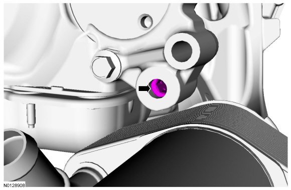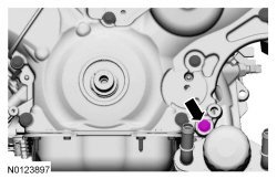 6. Install the engine front cover-to-oil filter adapter bolt and tighten to 25 Nm (18 lb-ft) plus an additional 60 degrees.