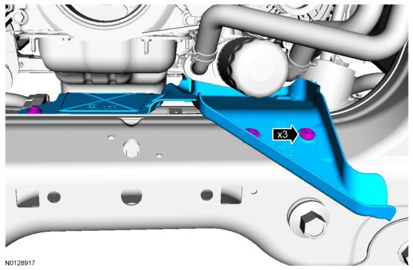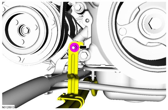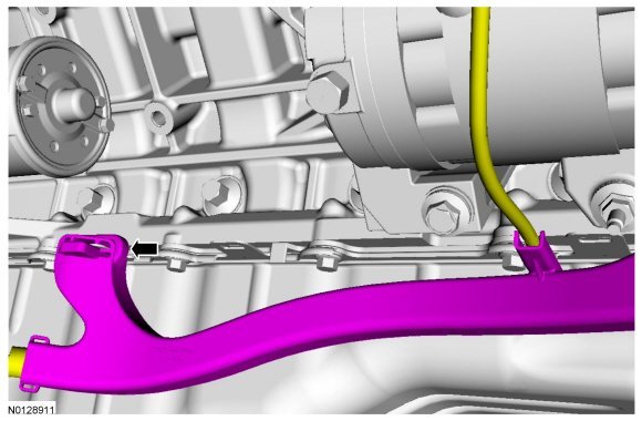 24. Remove the nut and the transmission cooler tube bracket from the engine front cover stud bolt.