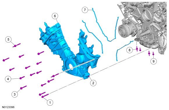 4. NOTE: The engine front cover must be installed and all fasteners final tightened within 5 minutes of applying the sealer. If this cannot be accomplished, install the engine front cover and tighten fasteners 6, 7, 8, 9, 10 and 11 to 8 Nm (71 lb-in) within 5 minutes of applying the sealer. All of the fasteners must then be final tightened within 1 hour of applying the sealer. If this time limit is exceeded, all sealant must be removed and the sealing area cleaned. To clean the sealing area, use silicone gasket remover and metal surface prep. Follow the directions on the packaging. Failure to follow this procedure can cause future oil leakage.