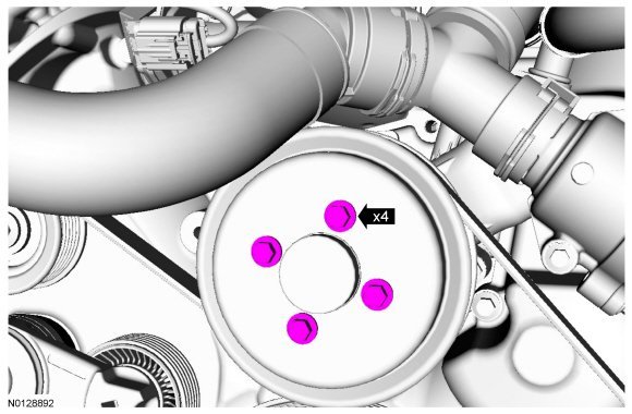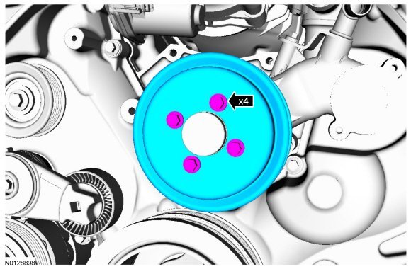 30. Tighten the 4 coolant pump pulley bolts to 25 Nm (18 lb-ft).