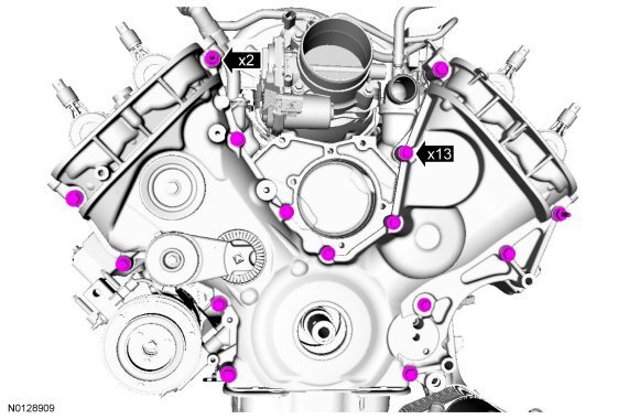 30. Remove the 13 engine front cover bolts and the 2 stud bolts.