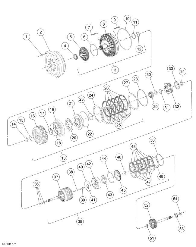 28. Install the low/reverse clutch plates, starting with the pressure plate and alternating between the friction and steel plates and ending with the wave spring plate on the top.