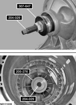 12. Using the Needle Bearing Installer, the Drawbar and the Front Wheel Hub Oil Seal Installer, install the bearing in the transmission case.
