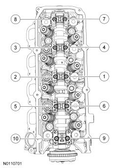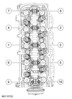 Position the camshaft bearing caps in their original locations and install the 10 bolts in the sequence shown in 2 stages.