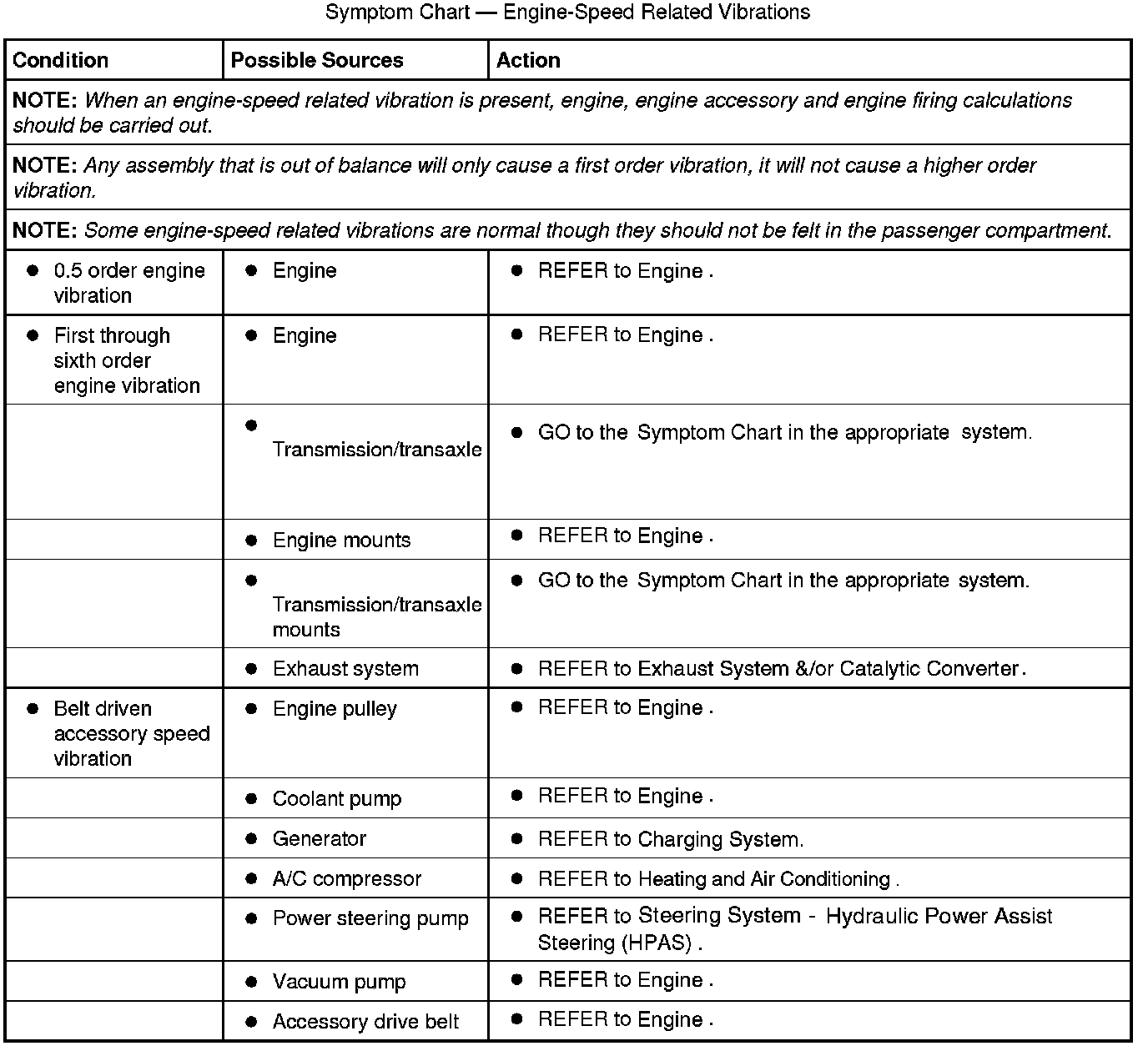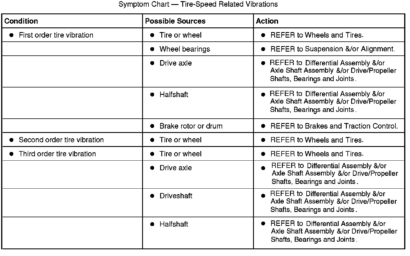 Use the diagnostic instructions along with the necessary listed tools to identify the vibration order and to isolate the symptom and the possible systems associated with that symptom. Then based on the results from the road test, make a determination of which action in the symptom chart to take first. Since it is possible any one of multiple systems may be the cause of the symptom, it may be necessary to use a process of elimination type diagnostic approach to pinpoint the concern. Refer to the system(s) indicated to identify and isolate the cause or rule that system out as being the causal system for the symptom.