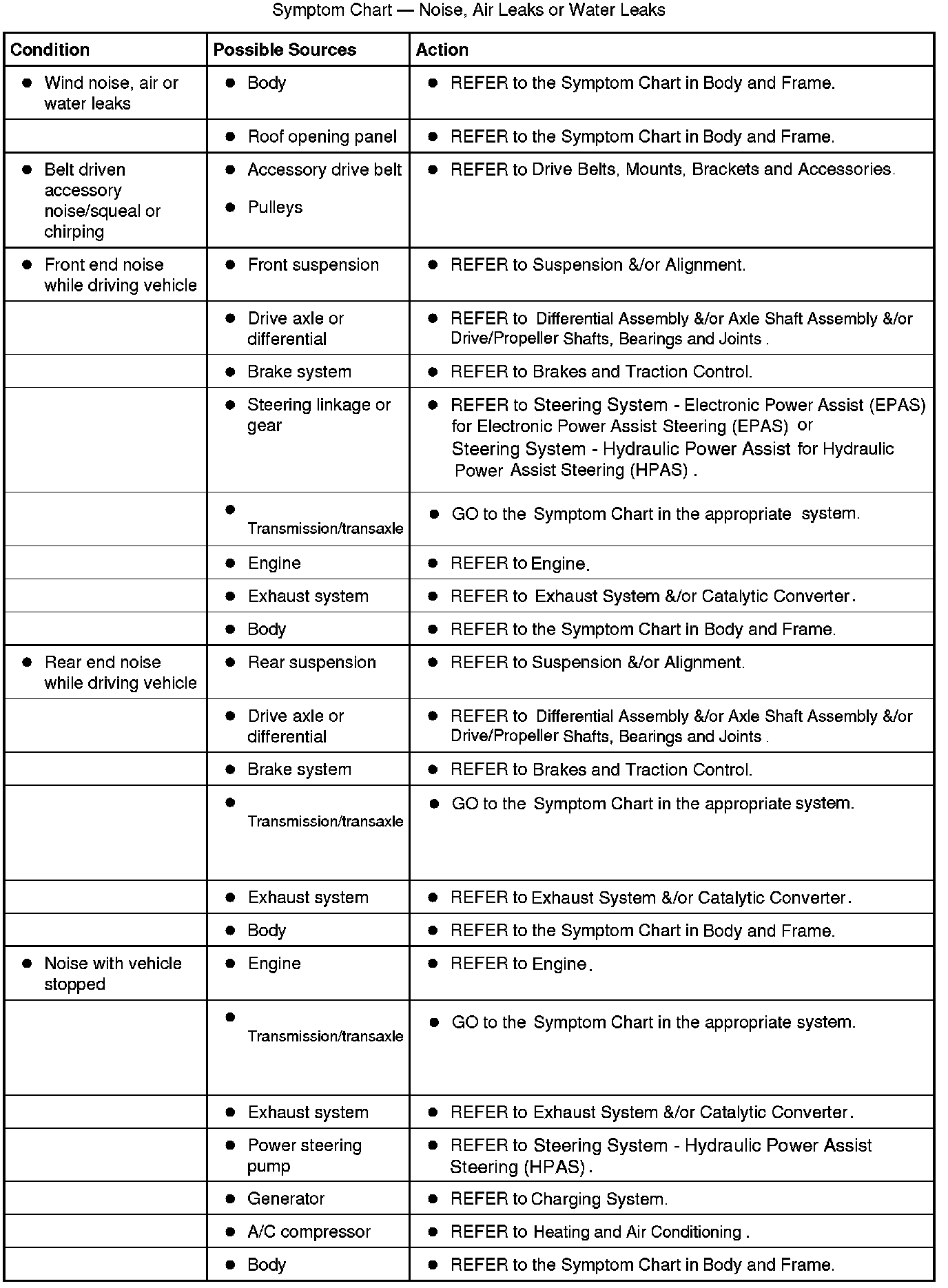 Once a symptom is classified as a noise, the particular conditions under which the noise occurs need to be identified. These conditions are identified and verified during the road test. For example, a noise may only occur while turning. The next step is to determine which systems on the vehicle are related to that condition. In this case, the steering system and wheel/tire system may be suspect. After identifying possible systems, a preliminary inspection of these systems should be done. If the source of noise is still unidentified, use a listening device (such as the ChassisEAR) to pinpoint the source. Once the source has been identified, determine if this source is related to the suspected system previously identified. If it is related, then complete the repair to resolve the customer concern. If it is unrelated, then it is possible that the source of the noise is a reactor to a noise being transmitted through a transfer path. If this is the case, repairing the reactor will not resolve the customer concern. The transfer path must be identified and a determination made if the noise is normal, but accentuated by the transfer path (conductor), or if the originator is the fault causing excessive noise to transfer to another component through a conductor. There is a relationship between systems identified as related to conditions and the noise transfer path. In some cases, the condition under which the noise occurs has nothing to do with the identified source. This relationship is important in the diagnosis of noise concerns. It is the first clue that the identified source of noise might be a reactor and that further investigation is needed to diagnose a possible noise transfer path concern. Based on the results from the road test, make a determination of which action in the symptom chart to take first.