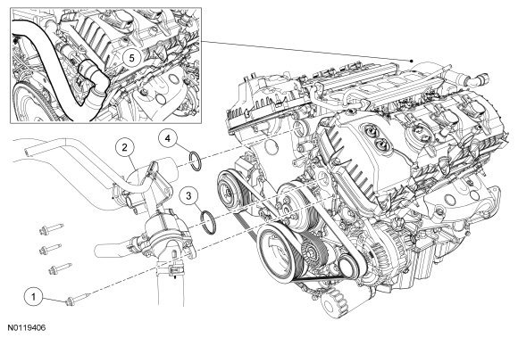 - Remove and discard the thermostat housing gasket and coolant tube O-ring seal.