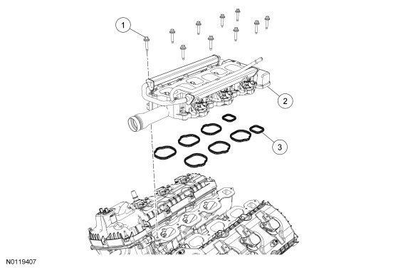 1. NOTICE: If the engine is repaired or replaced because of upper engine failure, typically including valve or piston damage, check the intake manifold for metal debris. If metal debris if found, install a new intake manifold. Failure to follow these instructions can result in engine damage.