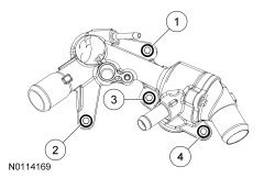 3. Using a new thermostat housing gasket and coolant tube O-ring seal, install the thermostat housing and the 4 bolts and tighten in the sequence shown in 2 stages.