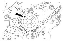 50. Remove the 2 bolts, the RH timing chain tensioner and tensioner arm.