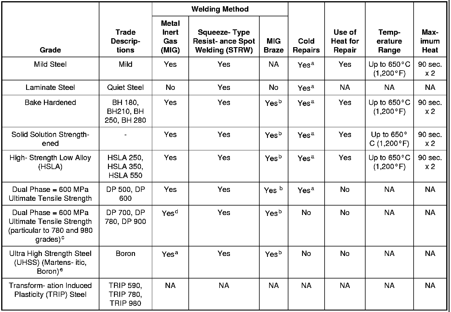 c Dual phase steels DP 700, DP 780 and DP 980 must be replaced at factory joints, no sectioning unless approved procedure in information.