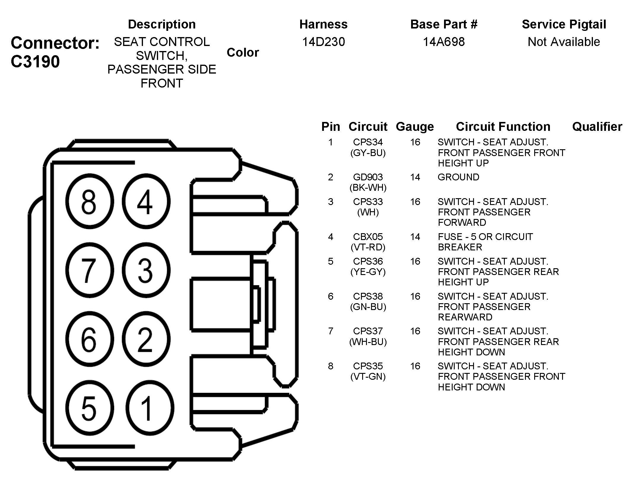C3190 Seat Control Switch, Passenger Side Front