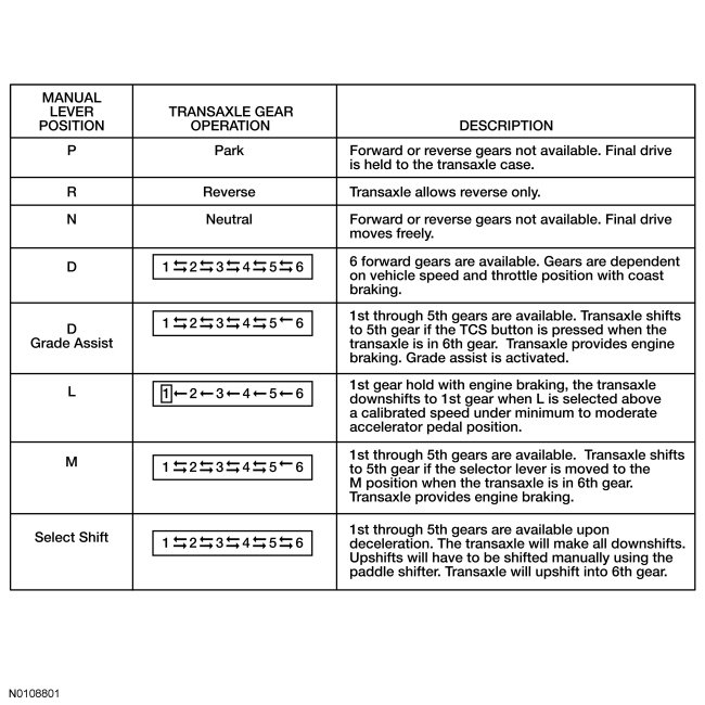 This transaxle has 5 range positions: P, R, N, D and L for vehicles equipped with a TCS (Transmission Control Switch) and P, R, N, D and M for vehicles equipped with paddle shifters.