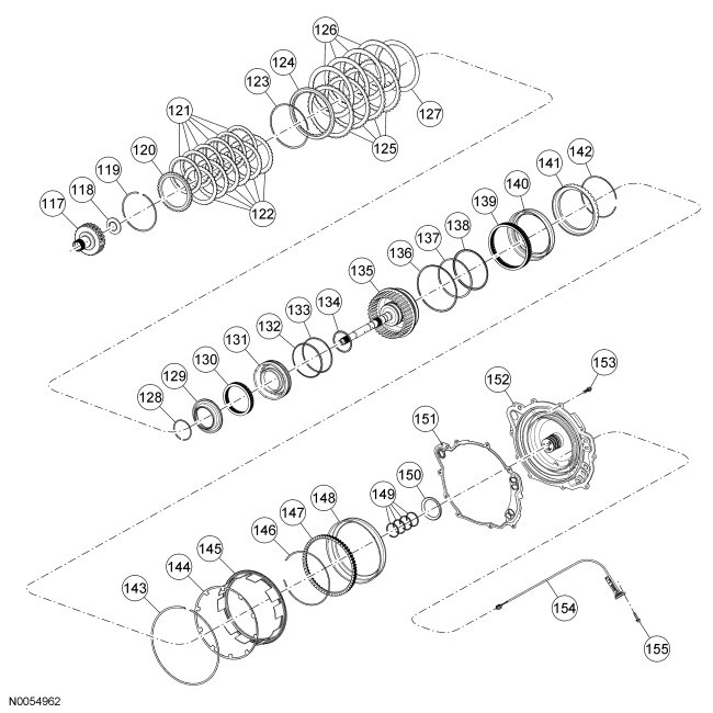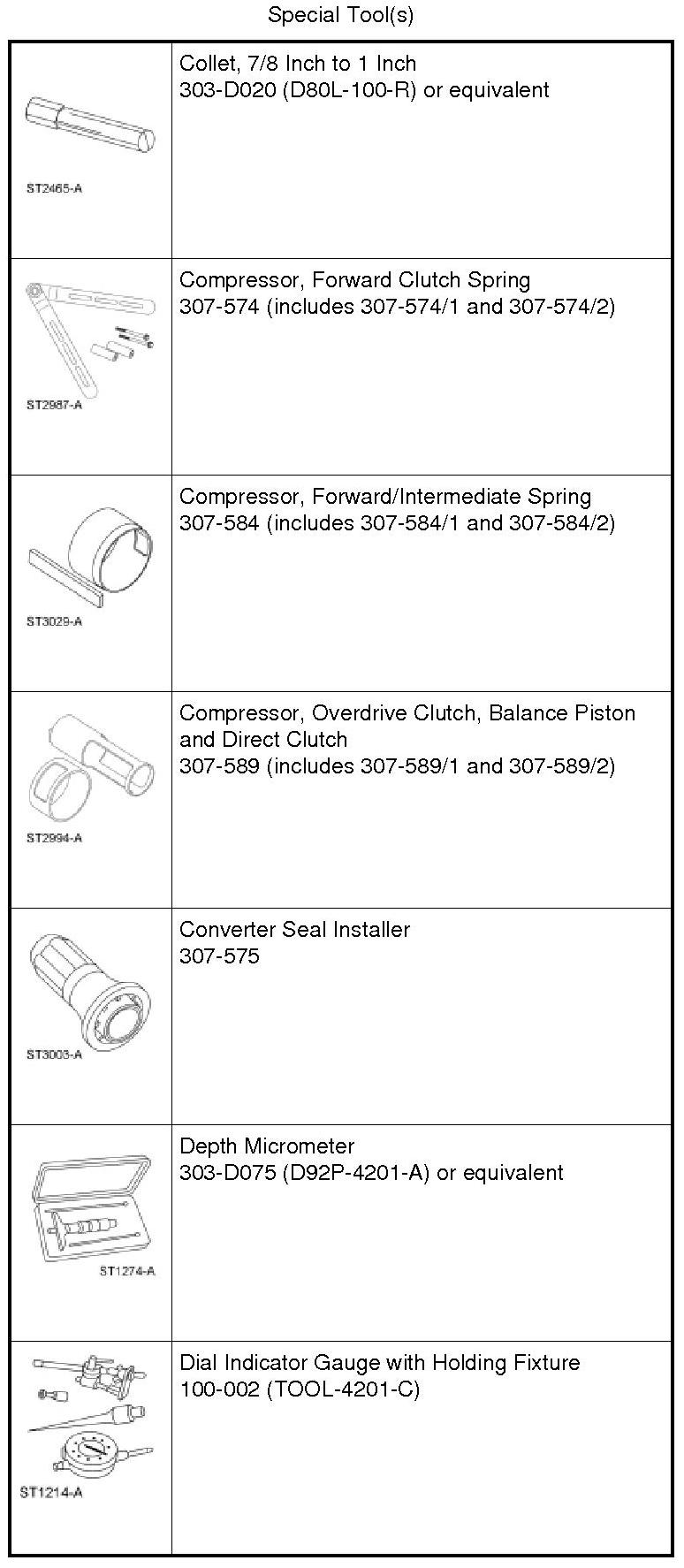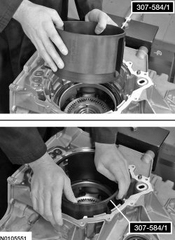 224. NOTE: Install the Forward/Intermediate Spring Compressor 307-584/1 with the stepped end of the cylinder facing downward when pushing the forward clutch piston into the bore.
