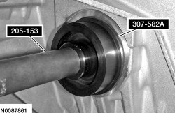 221. Using the Handle 205-153 and the Cover Axle Seal Installer 307-582A, install the halfshaft seal in the transaxle case.
