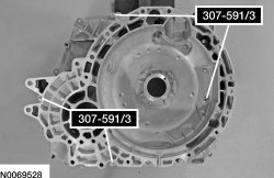 4. NOTE: Make sure that the silicone has been cleaned off the machined surface of the transaxle case and the torque converter housing before installing the Differential/Transfer Gear Bearing Shim Gauge 307-591/3 (4 spacers) or the preload measurement may be inaccurate.