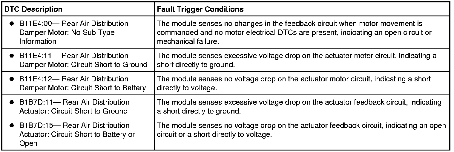 To rotate the auxiliary mode door actuator, the HVAC module supplies voltage and ground to the auxiliary mode door actuator through the door actuator motor circuits. To reverse the auxiliary mode door actuator rotation, the HVAC module reverses the voltage and ground circuits.