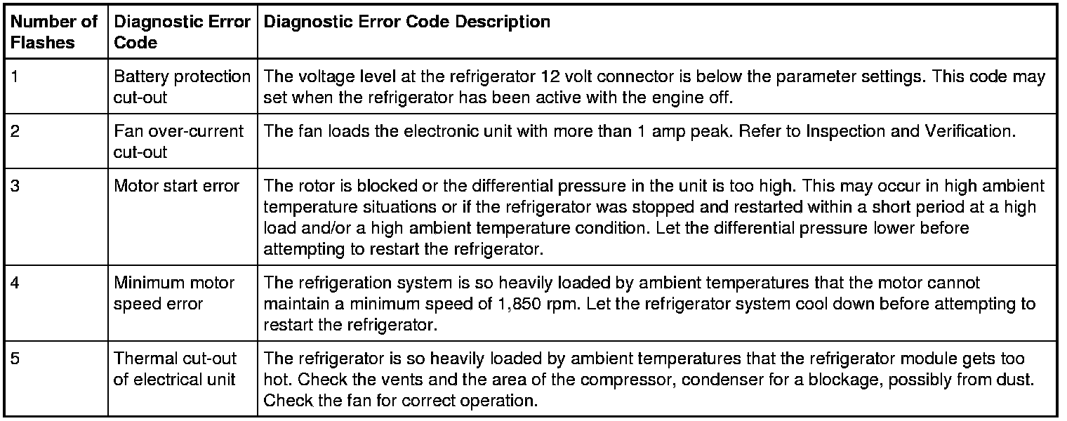 The refrigerator can be switched into a diagnostic mode to read the potential error codes of the compressor. When the refrigerator is in diagnostic mode, the COOL LED on the refrigerator switch will flash 1-5 times, depending on the error. Perform the following steps in order to access the refrigerator diagnostic mode: