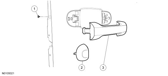 1. Slide the exterior rear door handle toward the left side of the vehicle to disengage it from the exterior rear door handle reinforcement.