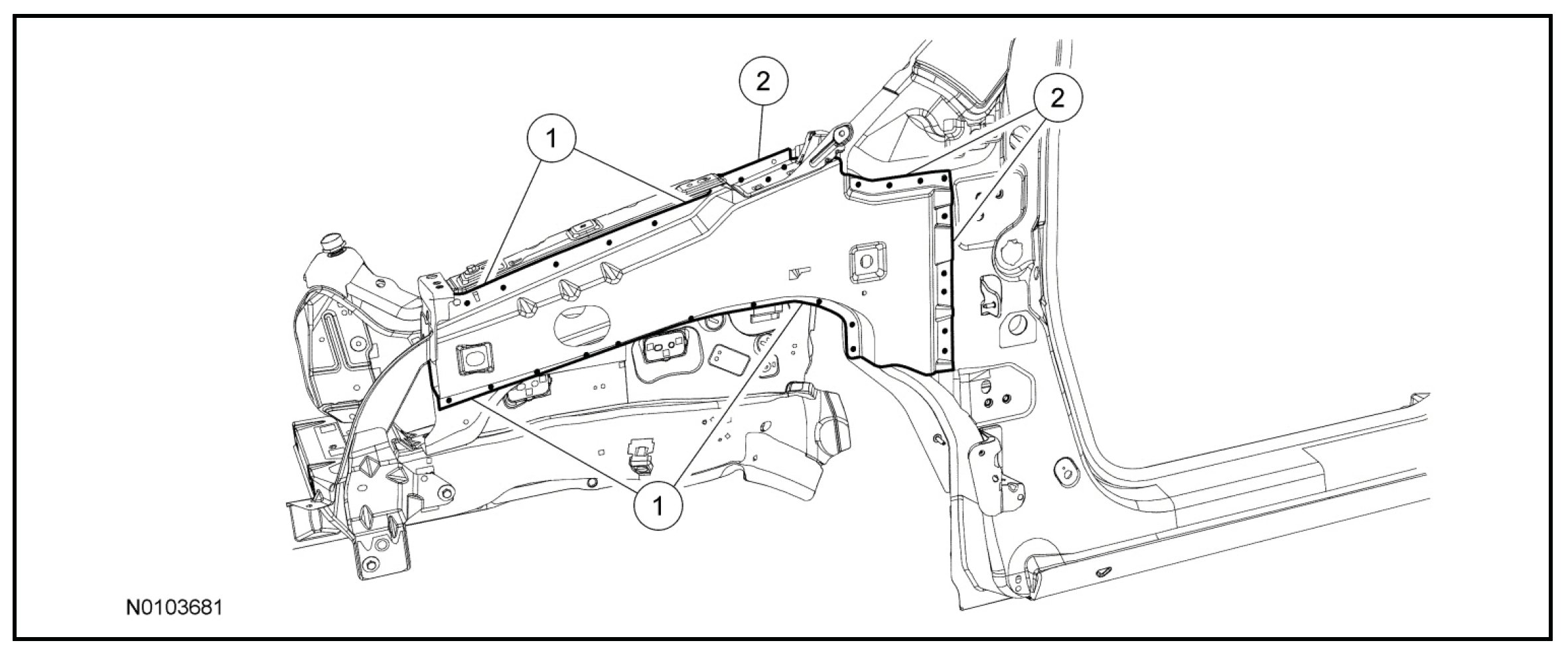 1. WARNING: Frame rail crush zones absorb crash energy during a collision and must be replaced if damaged. Straighten damaged frame rails to correct frame dimensions prior to frame member sectioning. Failure to follow these instructions may adversely affect frame rail performance and may result in serious personal injury to vehicle occupant(s).