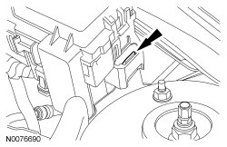 4. Press the locking tab, disconnect the BJB (Battery Junction Box) from the bracket and position the BJB (Battery Junction Box) aside.