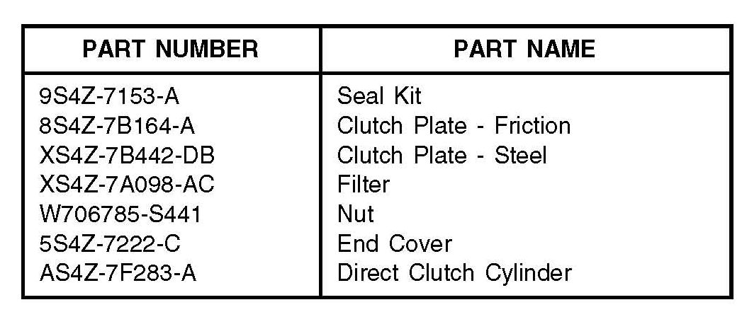 1. Remove the automatic transmission and repair as needed. For a direct clutch failure always replace the direct clutch cylinder and end cover in addition to any other worn parts. Refer to Workshop Manual (WSM), Section 307-01.